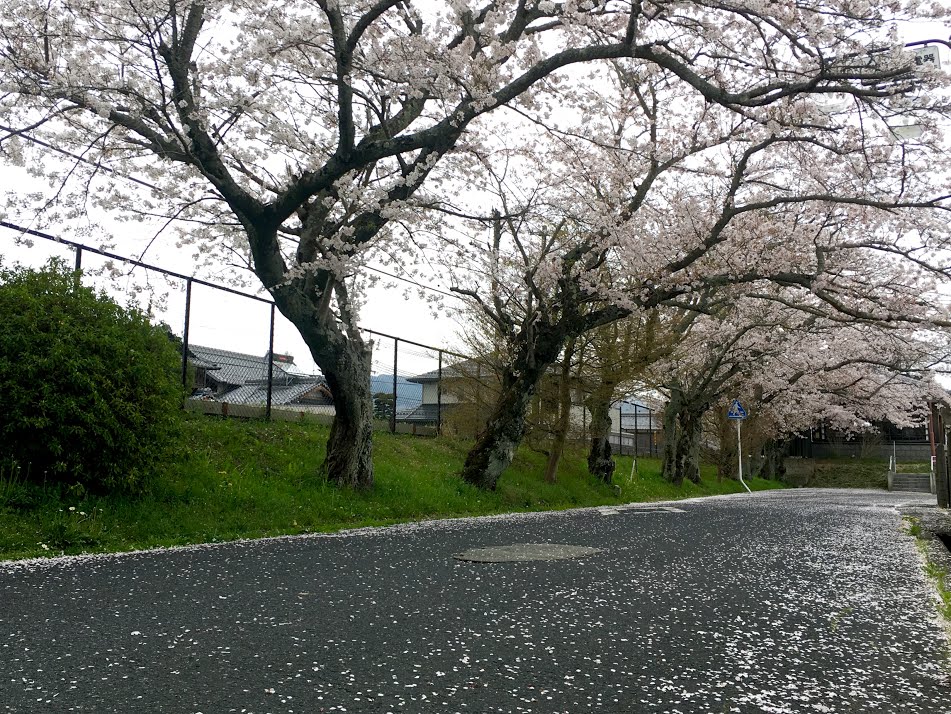 昨夜は雨、今日は午後から風が強くお店の前の油日駅前通りは桜吹雪が舞っていました。