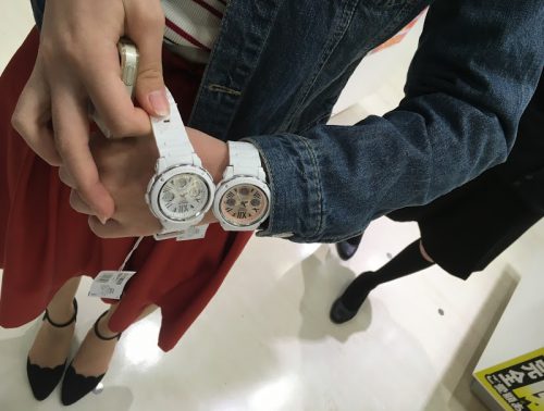 ベルトとフレームはシンプルな白色のBABY-G。文字盤の色でだいぶ悩んで張りましたが右側の方が気に入ったようです。