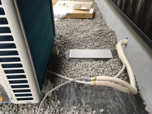 砂利を退けたらシートがあるからその上に室外機を置いてもらえばいいとわざわざ現場まで来てくれました。ホント気を使ってもらってありがたいです。