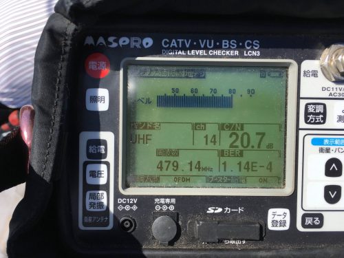 当店では事前に受信状態の調査を行い、確実に受信できる場所があるか確認をします。専用の機材で調査を行うと一目瞭然で、この表示から読み取れるのは電波の強さは十分だけど電波の質が悪くエラーも多いと読み取れます。