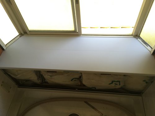 外した出窓の天板を綺麗に掃除しようとしていますが、傷や汚れがどうしても取れず何かいい方法がないかと数日間思案したところいい方法が浮かびました。詳細は企業秘密で(笑)