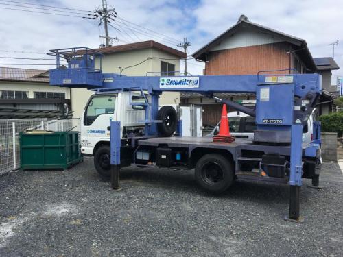 高所作業車はレンタルすると高いので他にもこの車を使ってできる仕事をまとめて行うようにして一件当たりのコストが下がるようにしています。今日は特に高いところなので17m。もちろん資格なしでは操作できません。
