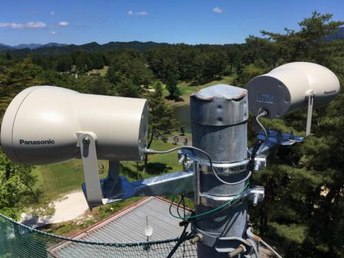 ゴルフ場のネットの支柱てっぺんに放送用スピーカーを取り付けます。天気が良くて景色が綺麗ですが・・・