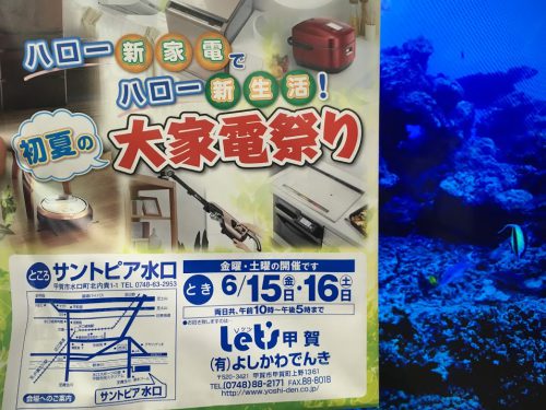 2018年06月14日 | 日常のこと・お知らせ、お知らせ合同展示会サントピア水口明日15日と明後日16日はサントピア水口で市内の日立のお店が集まった合同展示会を開催させていただきます。 こんばんは。地域のお助け隊よしかわでんきです。 午前中は準備に行く予定でしたが、前日納品した商品のトラブルで急遽会長に行ってもらい助かりました。 大きな会場ならではのお買い得商品も多数そろえています。ぜひお立ち寄りください。 二日間よろしくお願いいたします。 yoshiden