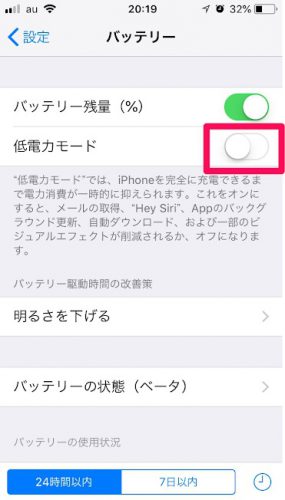 僕の持っているのはiPhoneですが、バッテリーメニューの中に省電力モードがあります。これをオンする事によって消費電力を抑えられるのです。