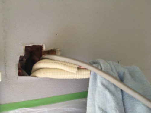 今日のエアコン取替工事も隠蔽配管でした。左から配管が出ていてホッとします。
