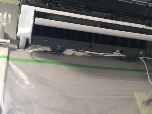 無事に収めることが出来ました。あとはカバーを取り付ければ室内側は完成です。同時進行で室外作業も行っています。雨避けの為にビニールシート内での作業です。